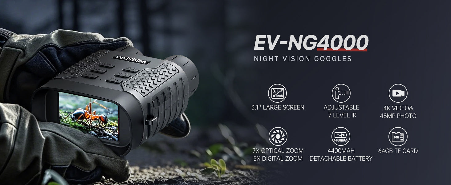 CoxiVision 4K Night Vision Goggles - 3.1'' HD Screen, 5X Digital Zoom, 7-Level IR Illuminator Binoculars with 64GB Memory Card and Detachable 4400mAh Battery - Day and Night Photo and Video Recording