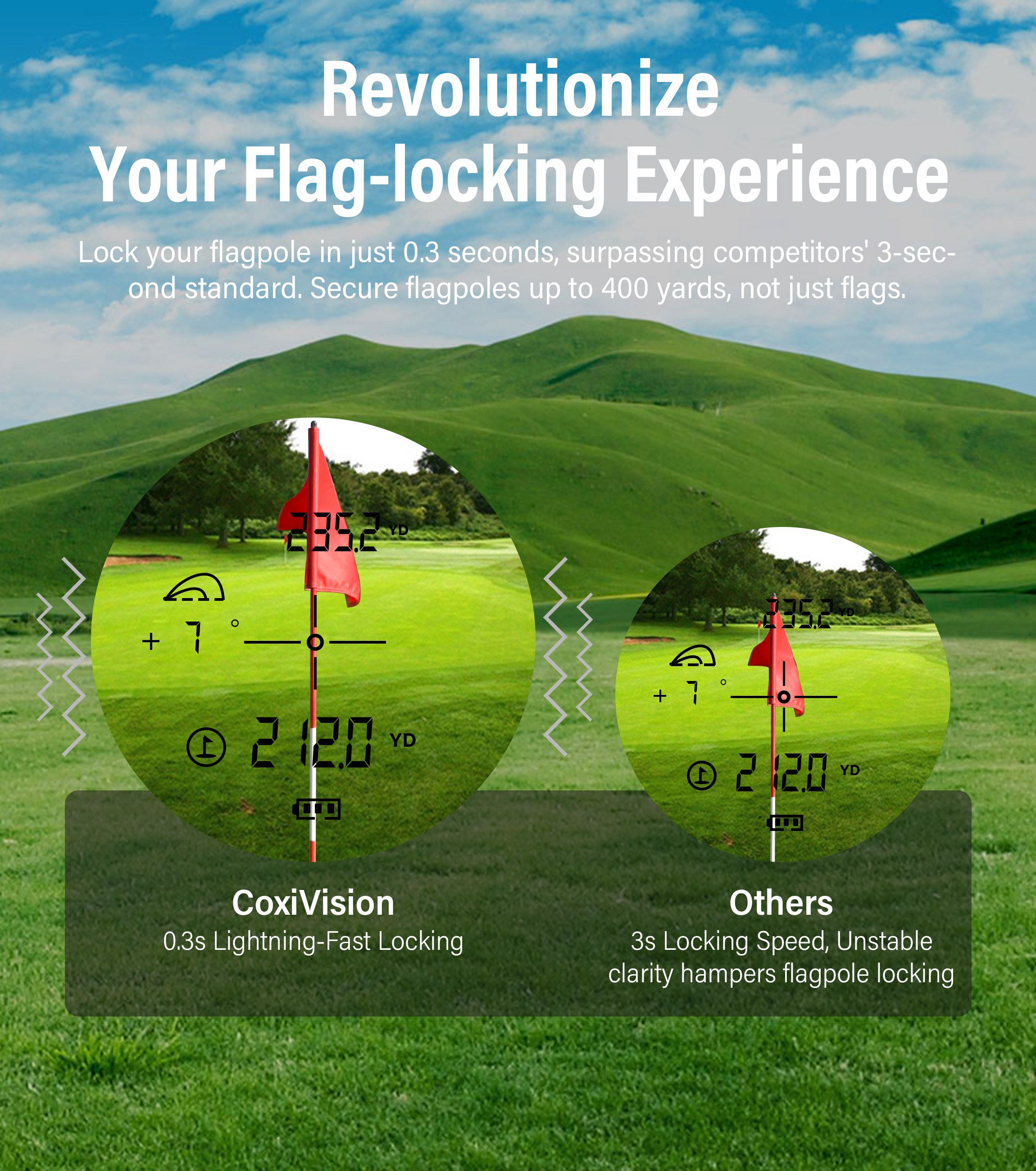 - Revolutionize Your Target-locking Experience: Lock your flagpole or target in just 0.3 seconds, surpassing competitors' 3-second standard, 10x Faster Than Competitors. the flagpole locking up to 350 yards, not just flags! while the pulse vibration system sends a pulse of vibration when you hit the pin to confirming a locked-on target